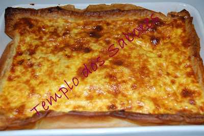 Deita-se o preparado numa forma já forrada com a massa folhada e leva-se ao forno a 180º durante 20-25 minutos.