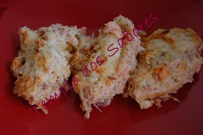 Despeja-se o molho no tabuleiro e envolve-se com o preparado de salmão. Cobre-se com queijo ralado e vai ao forno a gratinar.